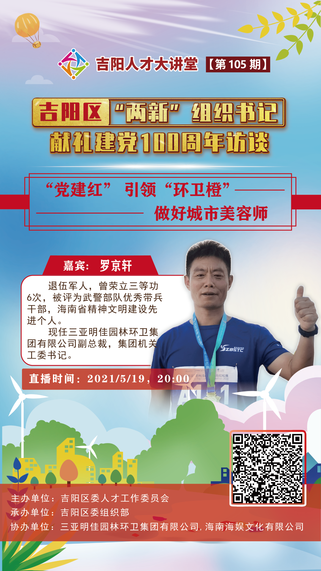 近日,第105期吉陽人才大講堂邀請(qǐng)到三亞明佳園林環(huán)衛(wèi)集團(tuán)有限公司副總裁、集團(tuán)機(jī)關(guān)工委書記羅京軒分享以“黨建紅”引領(lǐng)“環(huán)衛(wèi)橙”,助力城市清潔的好經(jīng)驗(yàn)、好做法,直播吸引近25.48萬人次在線觀看,其中不少網(wǎng)友為來自全國各地的環(huán)衛(wèi)工人。