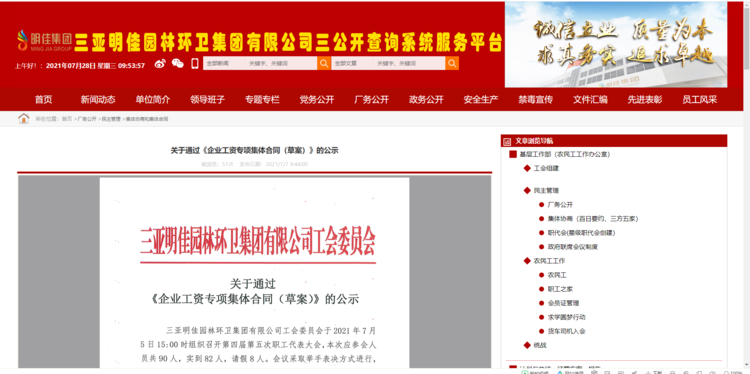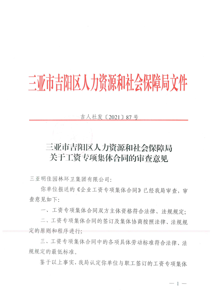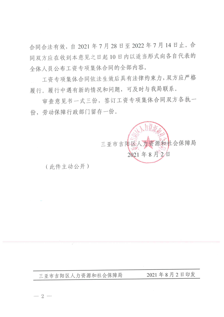 2021年8月2日,吉陽區(qū)人社局審查通過我公司《企業(yè)工資專項(xiàng)集體合同》。8月4日報(bào)三亞市總工會基層工作部備案。至此,三亞明佳園林環(huán)衛(wèi)集團(tuán)有限公司2021年度企業(yè)工資集體協(xié)商工作圓滿結(jié)束。