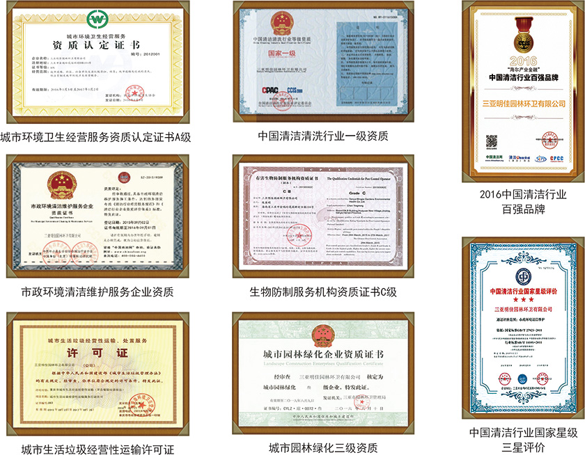 公司擁有建筑物外立面清潔養(yǎng)護(hù)施工甲級(jí)資質(zhì)、建筑物有害生物防治施工甲級(jí)資質(zhì)、建筑物日常清潔養(yǎng)護(hù)施工甲級(jí)資質(zhì)、中國清潔行業(yè)企業(yè)等級(jí)一級(jí)資質(zhì)證書、城市園林綠化企業(yè)資質(zhì)證書、有害生物防制服務(wù)機(jī)構(gòu)資質(zhì)證書C級(jí)、有害生物防制服務(wù)機(jī)構(gòu)C級(jí)資質(zhì)證書、中國清潔清洗行業(yè)國家一級(jí)等級(jí)資質(zhì)、城市生活垃圾經(jīng)營性清掃、收集、運(yùn)營許可證;城市生活垃圾經(jīng)營性運(yùn)輸、處置工作許可證、環(huán)境管理體系認(rèn)證證書、城市環(huán)境衛(wèi)生經(jīng)營服務(wù)資質(zhì)認(rèn)定證書(GB/T240012004/IOS14001:2004標(biāo)準(zhǔn))、職業(yè)健康安全管理體系認(rèn)證證書(GB/T28001—2011/OHSAS18001:2007標(biāo)準(zhǔn))、質(zhì)量管理體系認(rèn)證證書(GB/T19001—2008/iOS9001:2007標(biāo)準(zhǔn))、市政環(huán)境清潔維護(hù)服務(wù)企業(yè)資質(zhì)證書